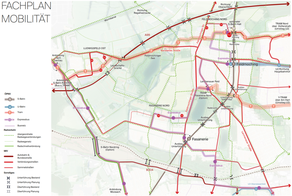 Wertvolle Landschaftsräume wie Feldmoching‑Nord/West, das Obermoos oder die Schrederwiesen bleiben freigehalten. Die neuen Quartiere knüpfen sensibel an den Bestand an; Freiräume verbinden neue und bestehende Strukturen. Ergänzende Versorgungs‑, Bildungs‑ und soziale Angebote stärken Bereiche, die heute unterversorgt sind. Ein vielfältiges Wohnungsangebot stärkt den sozialen Mix und schafft Perspektiven für die bestehende Bewohnerschaft.