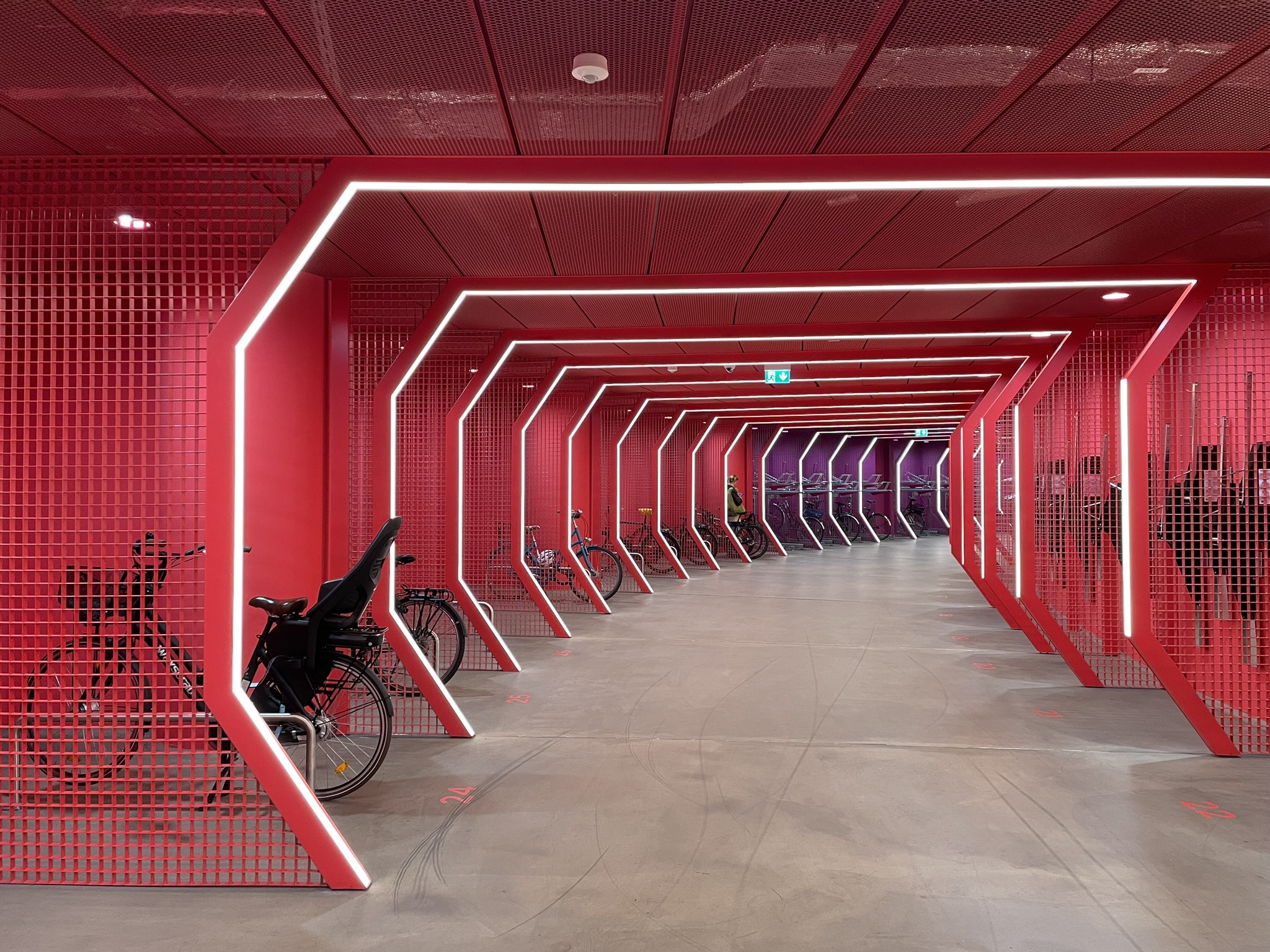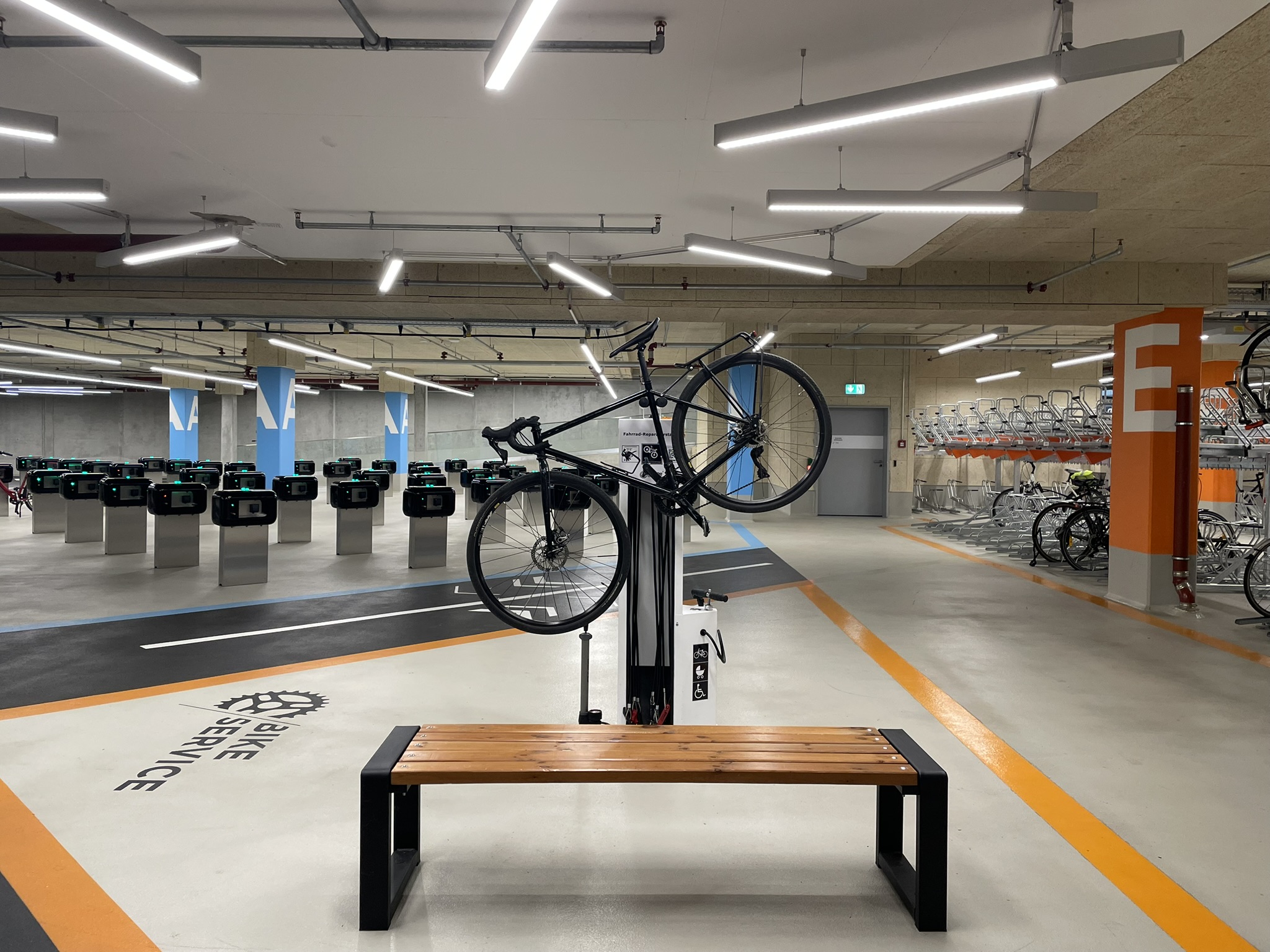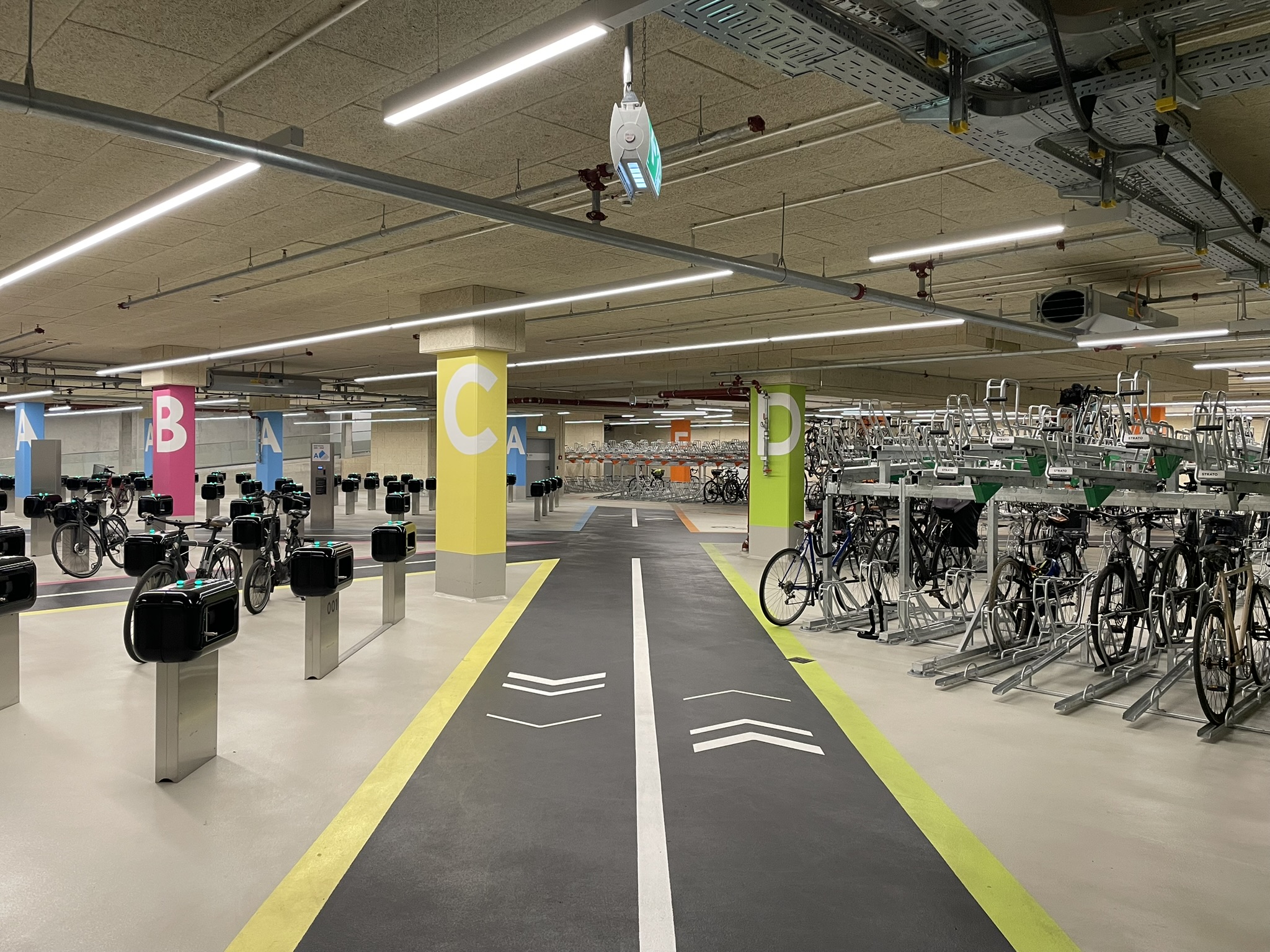 Gerade bei Anlagen in Untergeschossen können technische Hilfen wie Förderbänder oder Treppenspuren eine sinnvolle Ergänzung sein. Das Bike Parking am Potsdamer Platz nutzt hier eine technisch unterstützte Treppenspur, die das Schieben der Räder erleichtert. Vergleichbare Ansätze finden sich etwa in der Fietsenstalling 18 Septemberplein in Eindhoven, wo Fahrsteige gemeinsam von Fußgänger:innen und Radfahrenden genutzt werden können.