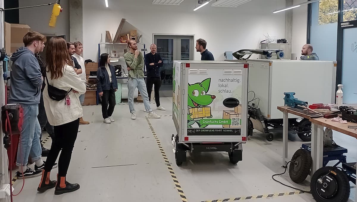 Im Anschluss besuchten wir NÜWIEL, ein Hamburger Unternehmen, das elektrisch unterstützte Lastenanhänger für die urbane Logistik entwickelt und produziert. Der innovative E-Trailer ist mit einem 250-Watt-Hubmotor ausgestattet, erreicht eine Geschwindigkeit von bis zu 25 km/h, bietet eine Reichweite von über 50 Kilometern, erlaubt eine Zuladung von bis zu 150 Kilogramm und verfügt über ein modernes Bremssystem (regenerativ, Overrun- und Electric Park Brake).